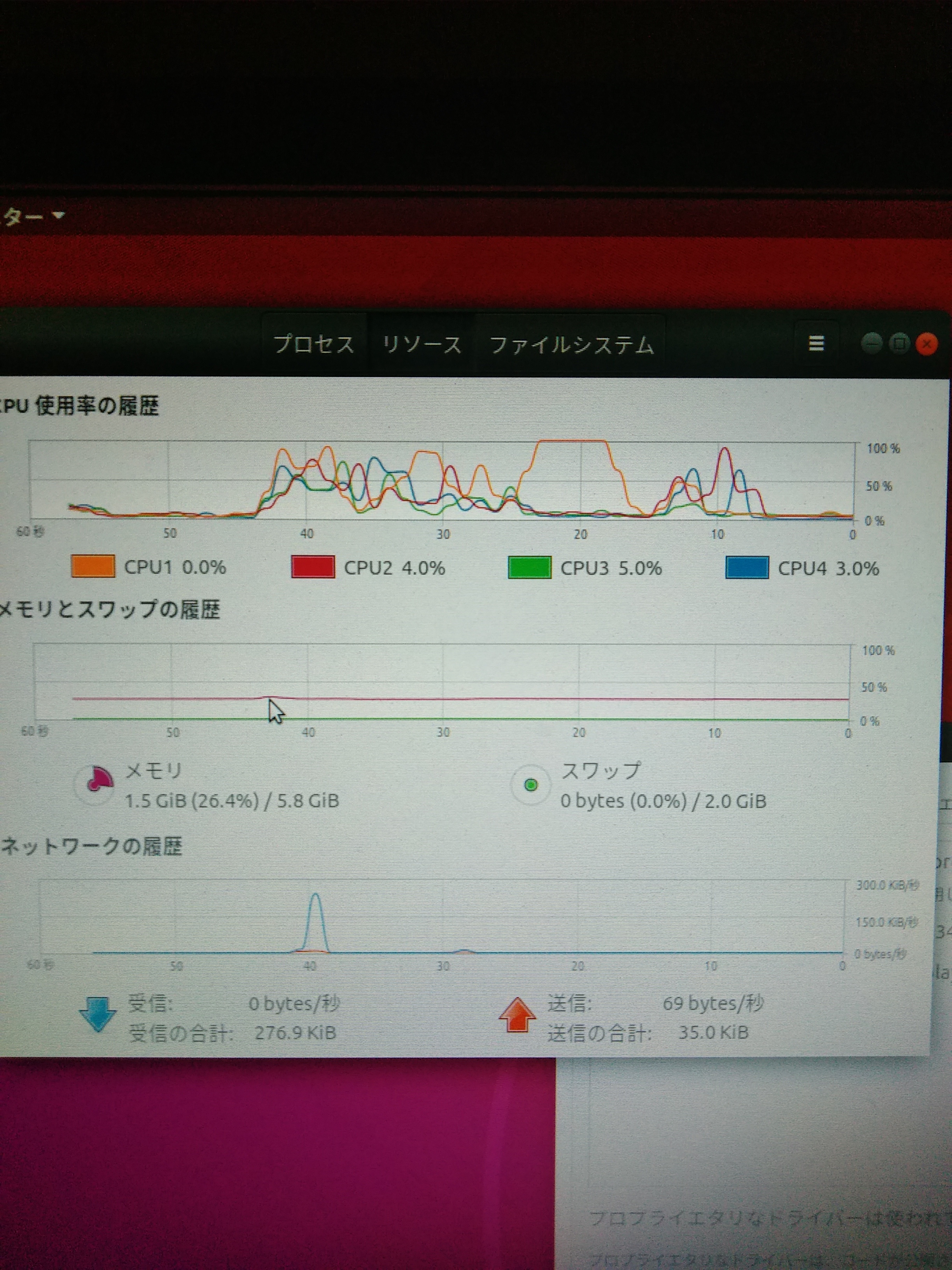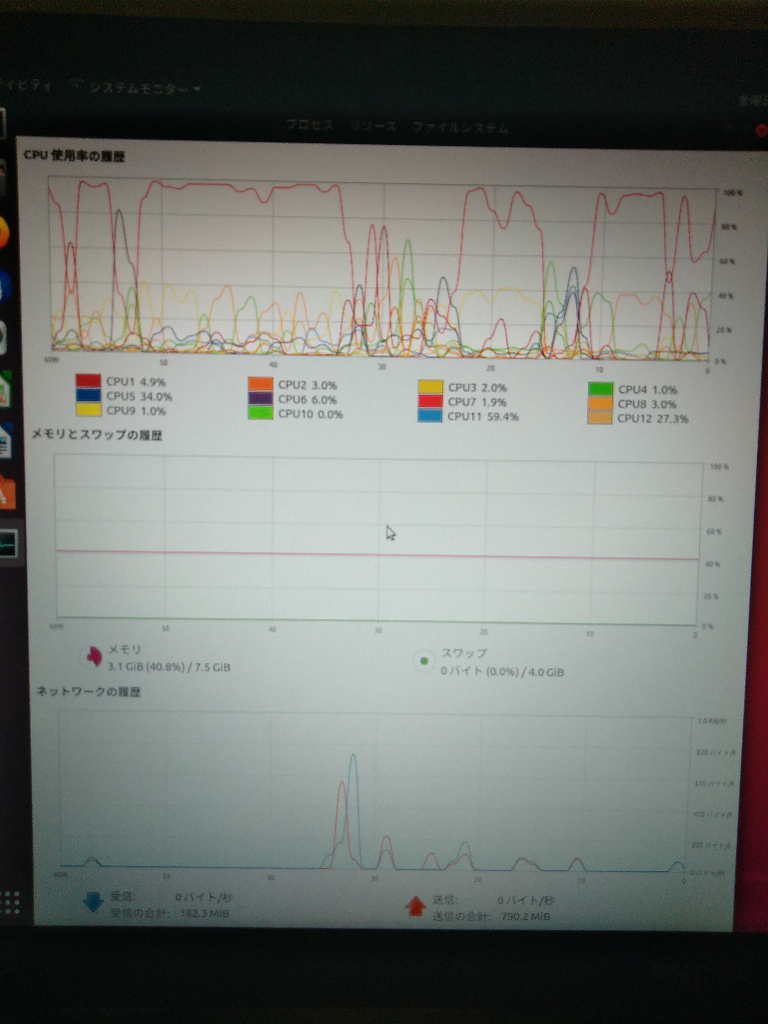 i3は2コア4スレッド。Xeon E-2136は6コア12スレッドなので真面目に三倍です。画像はテストのために負荷を掛けている状態。通常はブーストがかかっているコア1つが100%行くことがあっても、軒並み50%程度で推移。旧鯖よりも余裕があるので使用率が原因でデスクトップの動作が固まることがありません。相変わらずHDDの読み込みの時間は掛かりますが。
